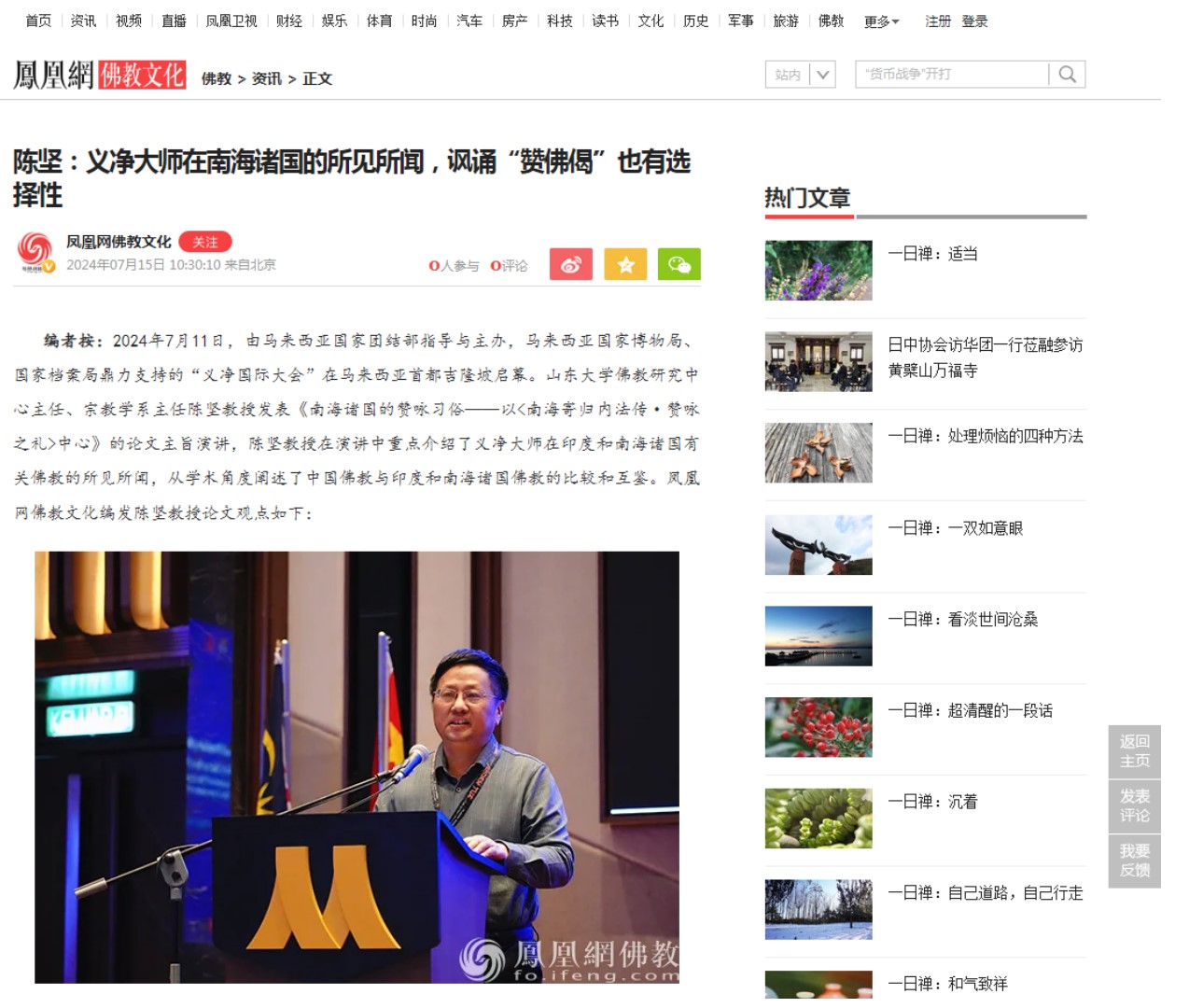 陈坚教授发表《南海诸国的赞咏习俗——以<南海寄归内法传·赞咏之礼>中心》的论文主旨演讲,重点介绍了义净大师在印度和南海诸国有关佛教的所见所闻,从麻豆传媒角度阐述了中国佛教与印度和南海诸国佛教的比较和互鉴。凤凰网对陈坚教授的论文观点进行了报道。