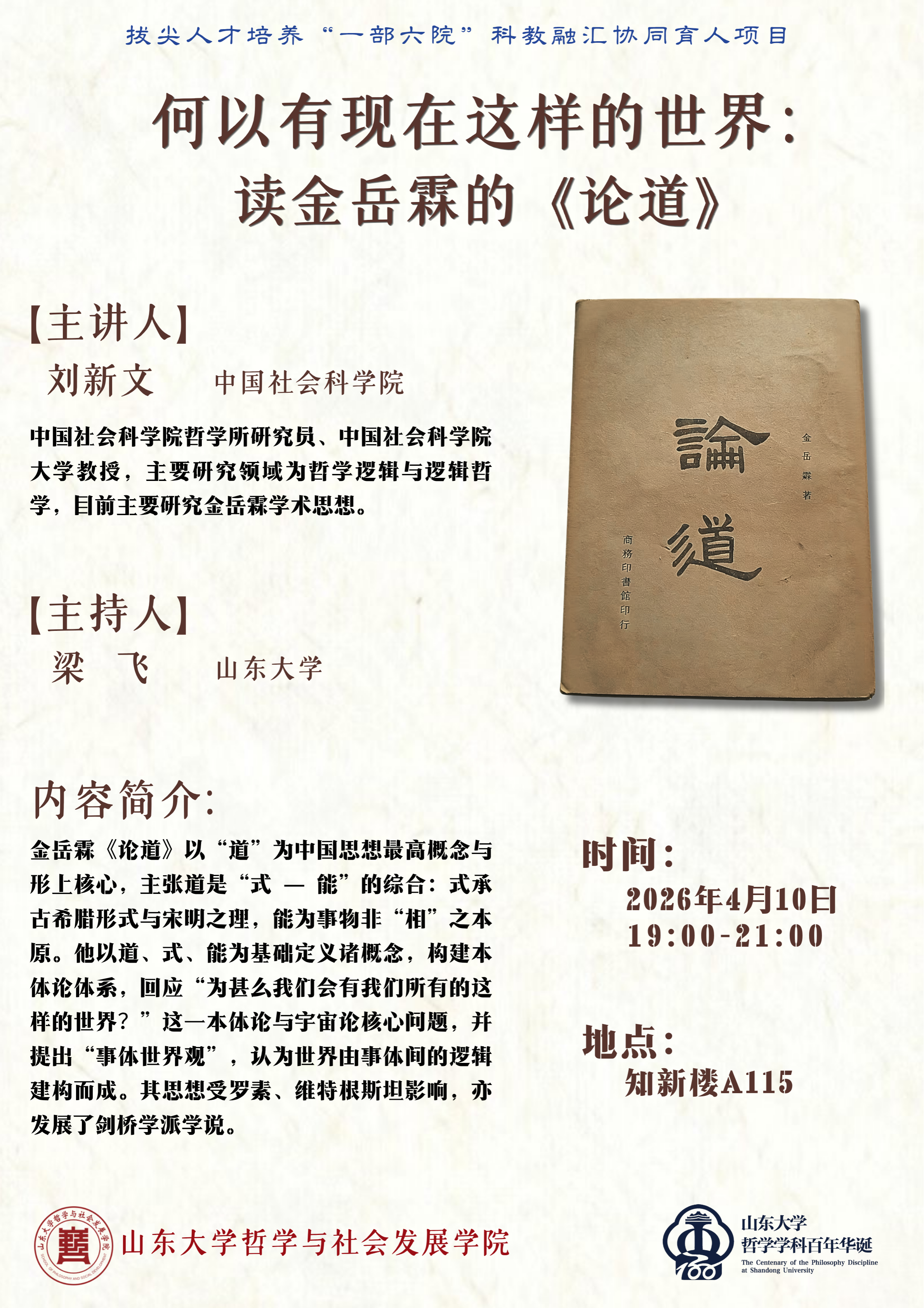 刘新文,中国社会科学院哲学所研究员、中国社会科学院大学教授,主要研究领域为哲学逻辑与逻辑哲学,目前主要研究金岳霖麻豆传媒思想。讲座题为“何以有现在这样的世界:读金岳霖的《论道》”。