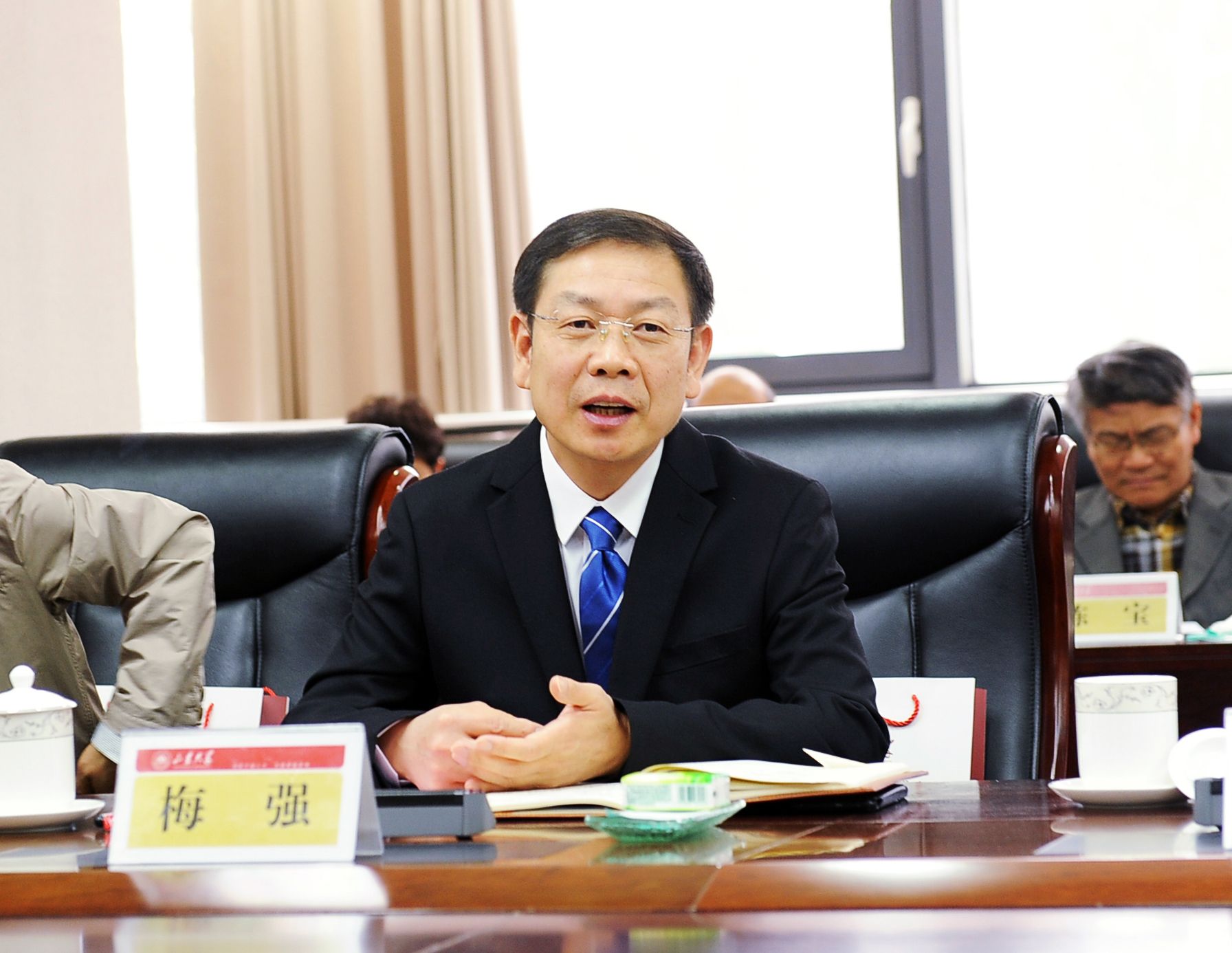党委书记梅强参加会见和座谈活动。座谈会由哲学系1980级校友牛建科主持。