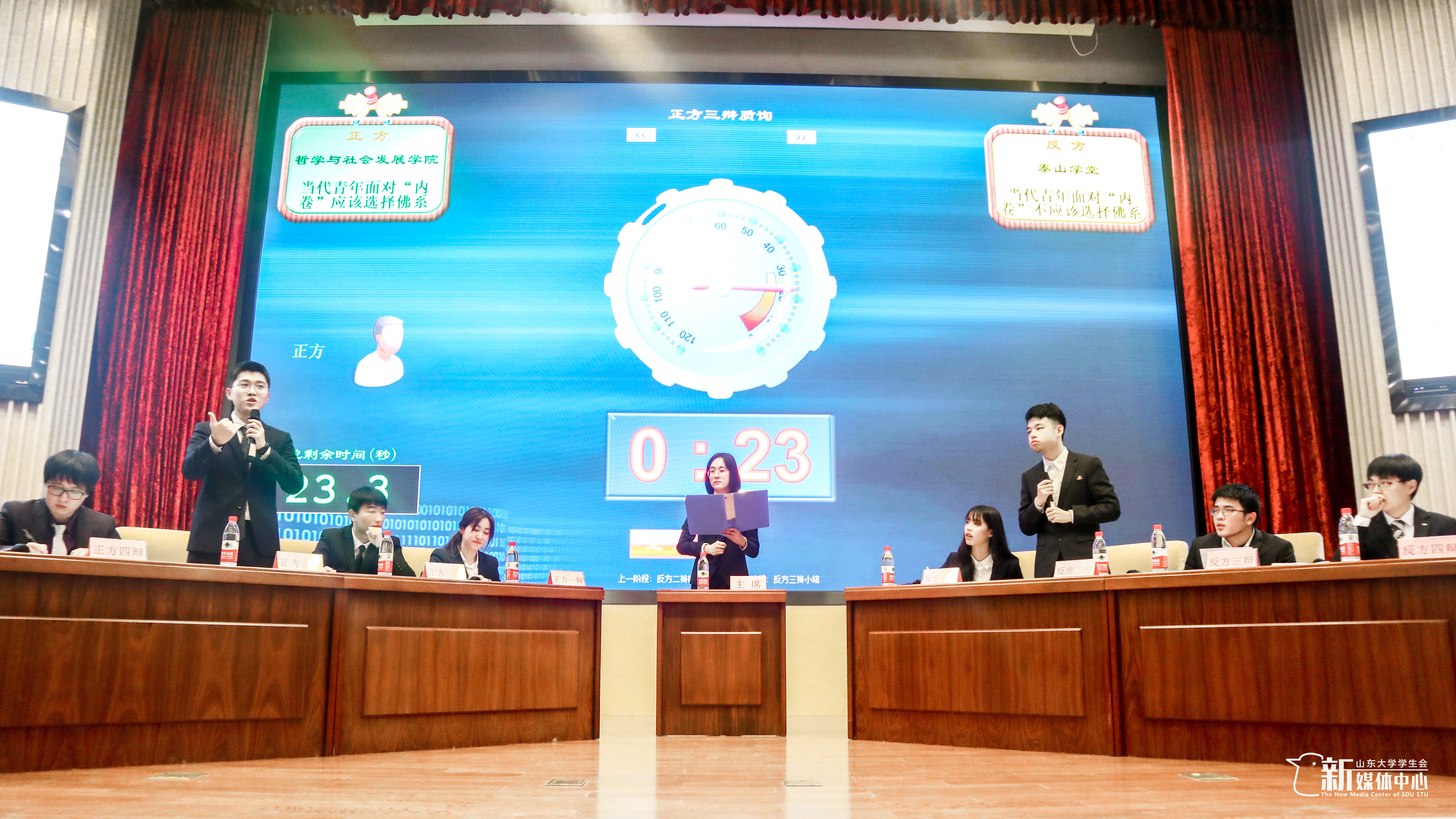 立足佛系的定义和作用,从个人、社会等层面,论述“佛系”能够帮助青年追求更精彩的人生,帮助社会解决内卷的风气,并从定义出发,引用原典,并举出许多“佛系”青年成就精彩人生的例子,对反方的质询有力回击。最终,哲社辩论队以5:2的成绩取得胜利,斩获本年度山大辩论赛冠军,三辩于耀翔获得山大杯全程最佳辩手称号。