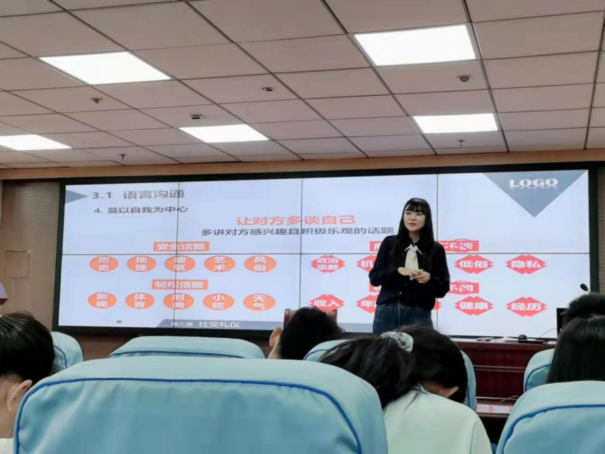 ,生活在同一间寝室,应彼此包容,相互理解,共同营造良好的宿舍氛围。其次,班梦姣介绍了社交礼仪。她提到,不论是大学生活中的人际交往还是未来学习工作中的社交,都需要掌握基本的礼仪知识。除此之外,班梦姣还介绍了一些常见的社交动作,并请台下同学上台参与互动,现场气氛热烈活跃。会议的最后,班梦姣还对生活中常见的电话礼仪进行了简要介绍。