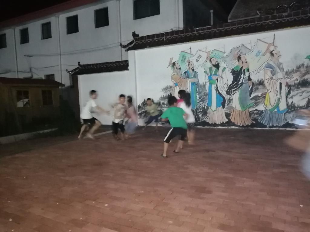 随后,我们来到了葵堌堆文化广场,在这里碰到了去年访问过的留守儿童小意(化名)。在于小意的谈话中我们得知,由于家庭经济情况太差,她打算放弃学业外出务工。队员们向她介绍了学校的各种助学政策,帮助她解决学习上的困惑和问题,并鼓励她继续完成学业。在聊天结束的时候,小意对队员们的倾听和帮助表示了感激。晚饭后,队员们再次来到葵堌堆文化广场,和孩子们一同嬉戏聊天,在欢声笑语中结束了今天的回访调研。乡村教育问题的再发现,为下一步的深入调研提供坚实的基础。